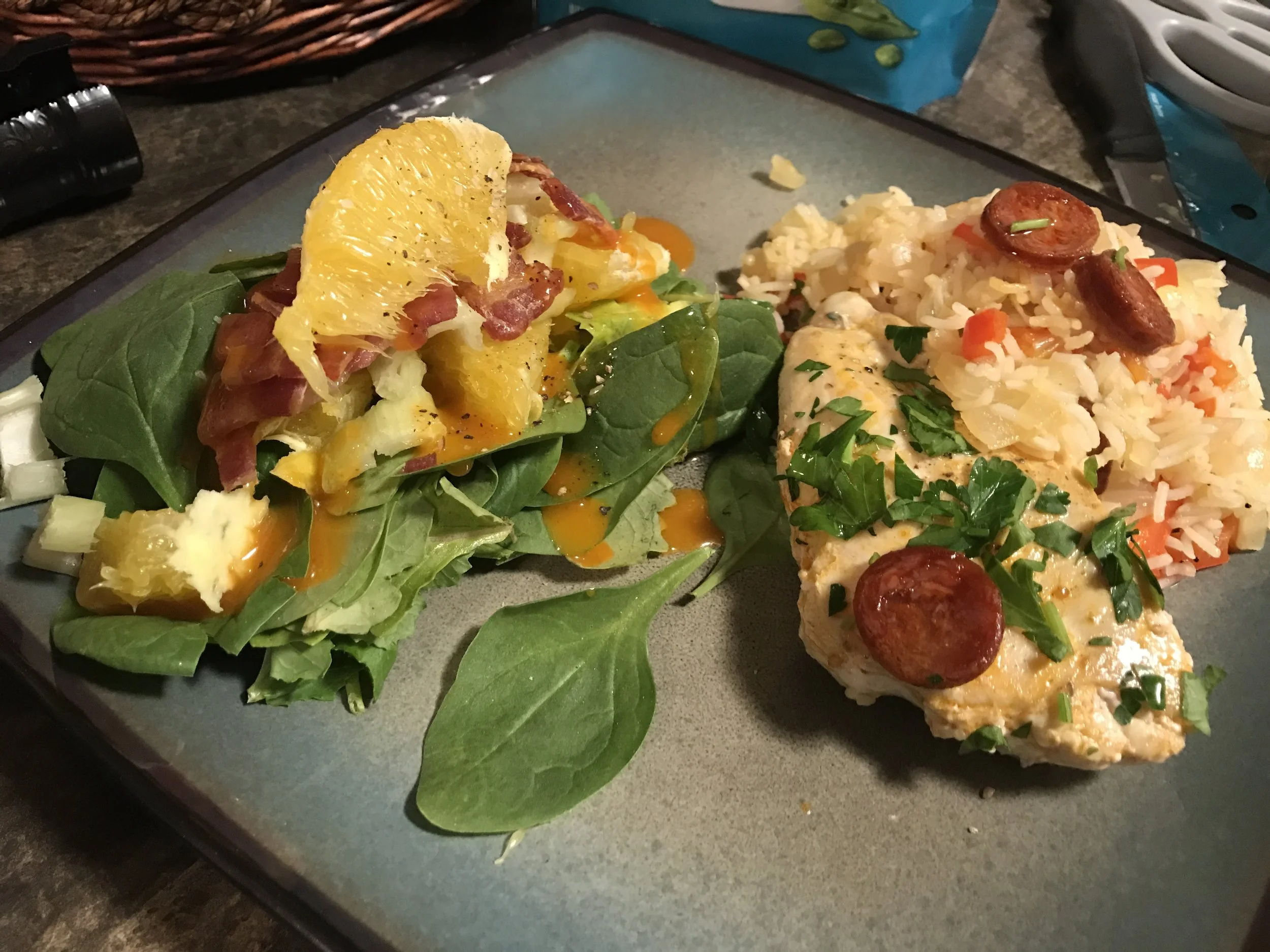 This one was...not great. It wasn't bad, but it was not spectacular. For starters, even though we followed the cooking directions exactly, and we're not bad cooks, the chicken was pretty raw. The ten minutes of cook time wasn't enough. The elements of the dish also didn't go well together. It was standard white rice, with red bell pepper, a chicken breast on top, and a little chorizo. This was not special. It's the kind of thing you'd see for $7.99 on an Applebee's menu.